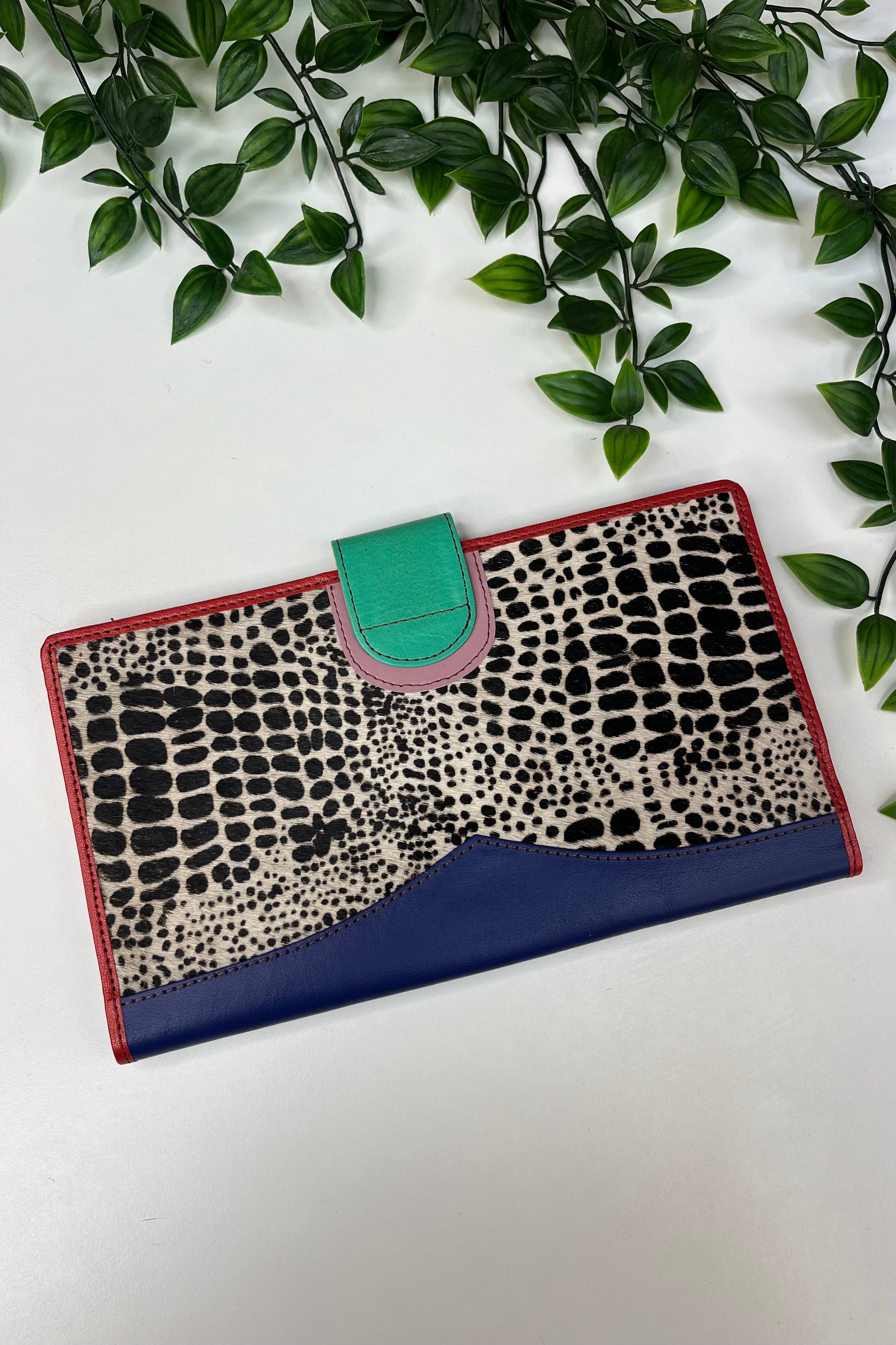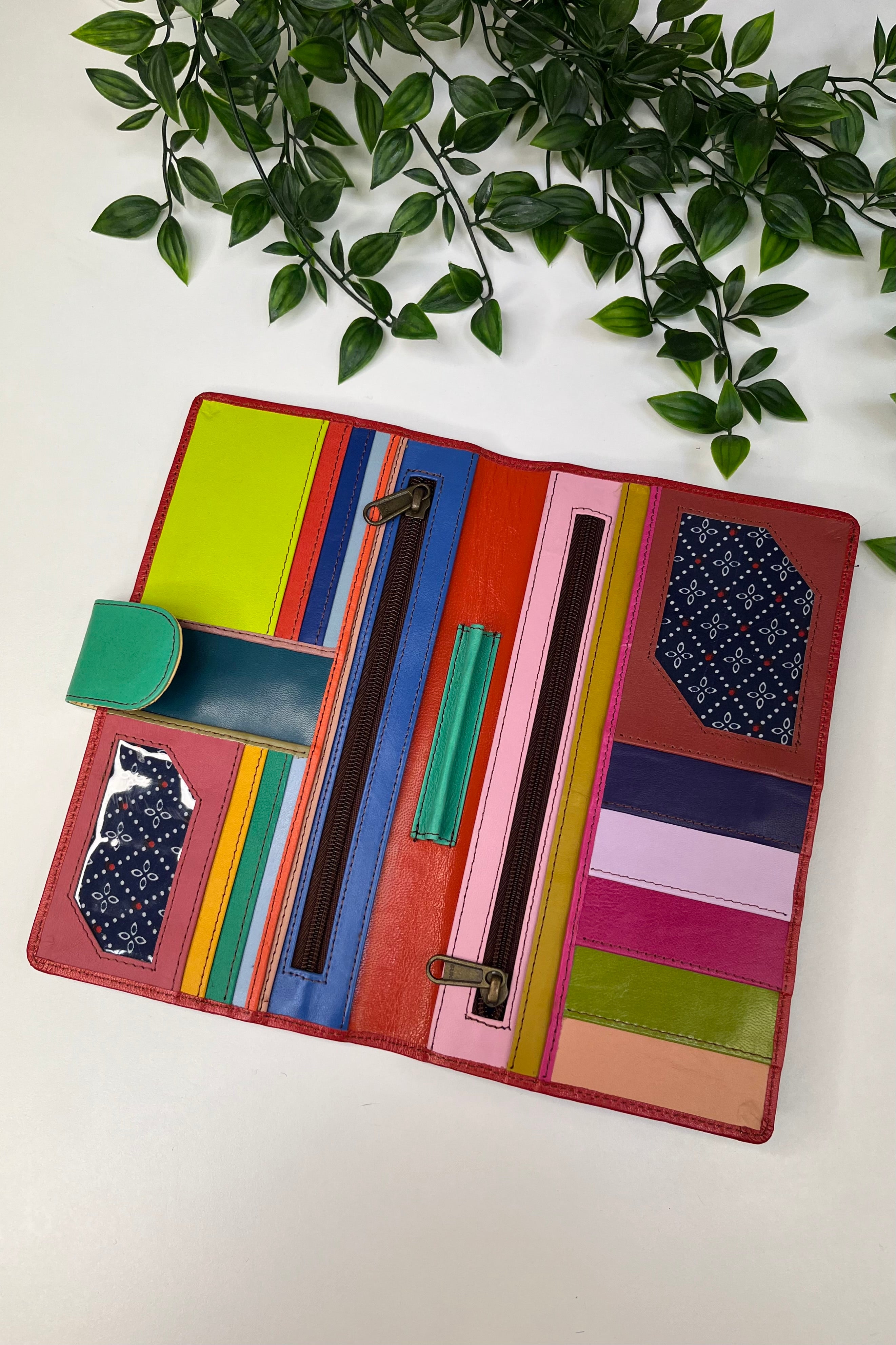 Made from recycled leather, each pouch has its own unique natural marks that add charm and blend beautifully with the bright colours over time.