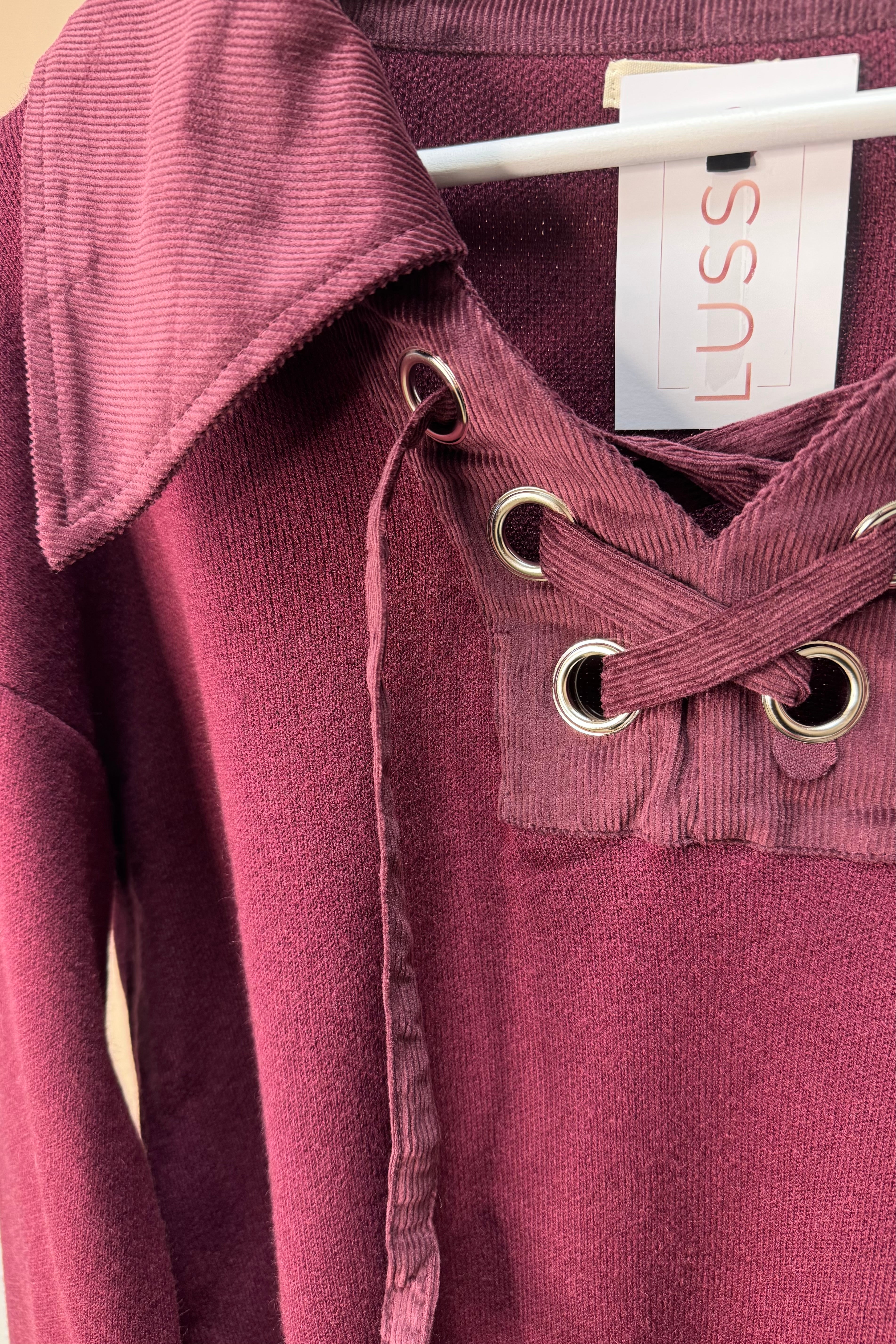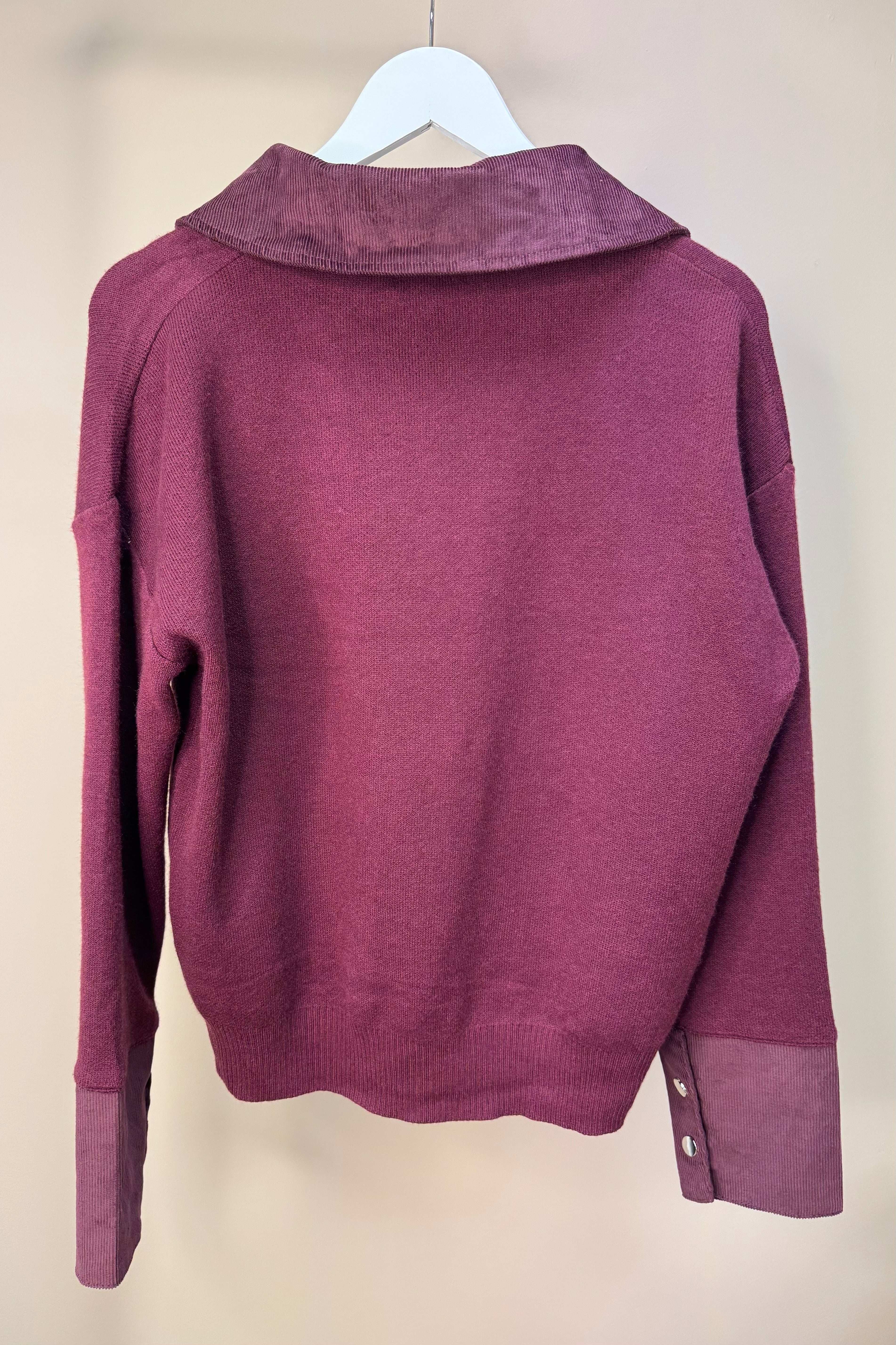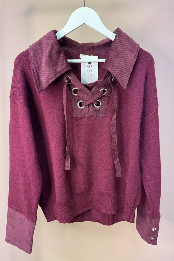 This wine knit offers a soft, cosy feel enhanced by a refined cord trim on the collar and cuffs for some edge. Its standout neck tie detail brings personality and charm to your outfit. Layer over our Striped Layering Top to add even MORE character!!