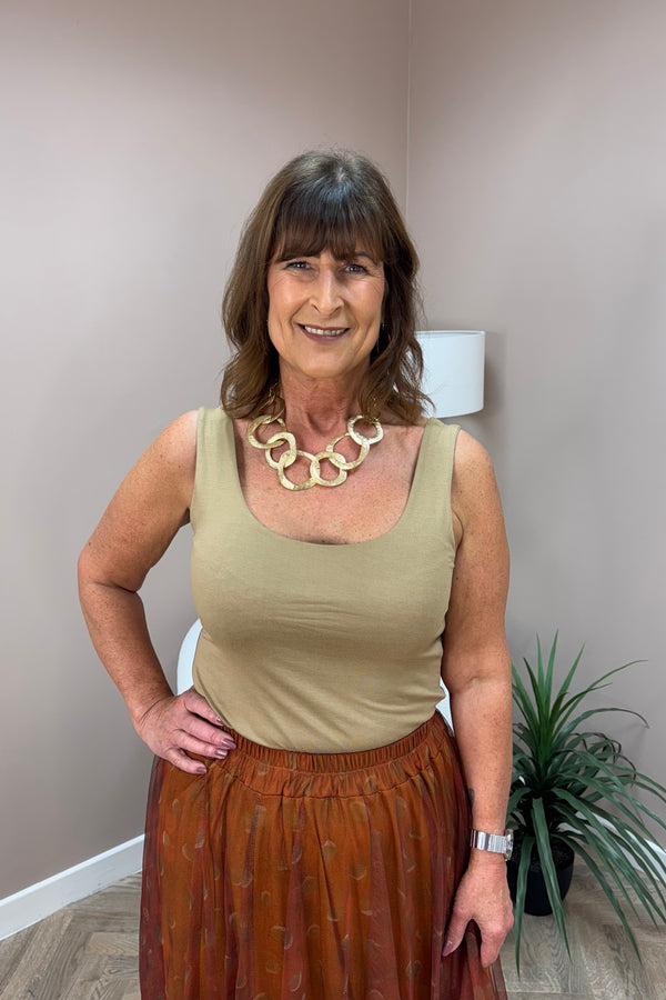 An elevated take on the everyday camel vest top, featuring wide straps and a clean, refined silhouette. Cut from soft, durable fabric for all-day comfort, this versatile piece transitions seamlessly from layering essential to standalone statement. A timeless staple for the modern wardrobe.