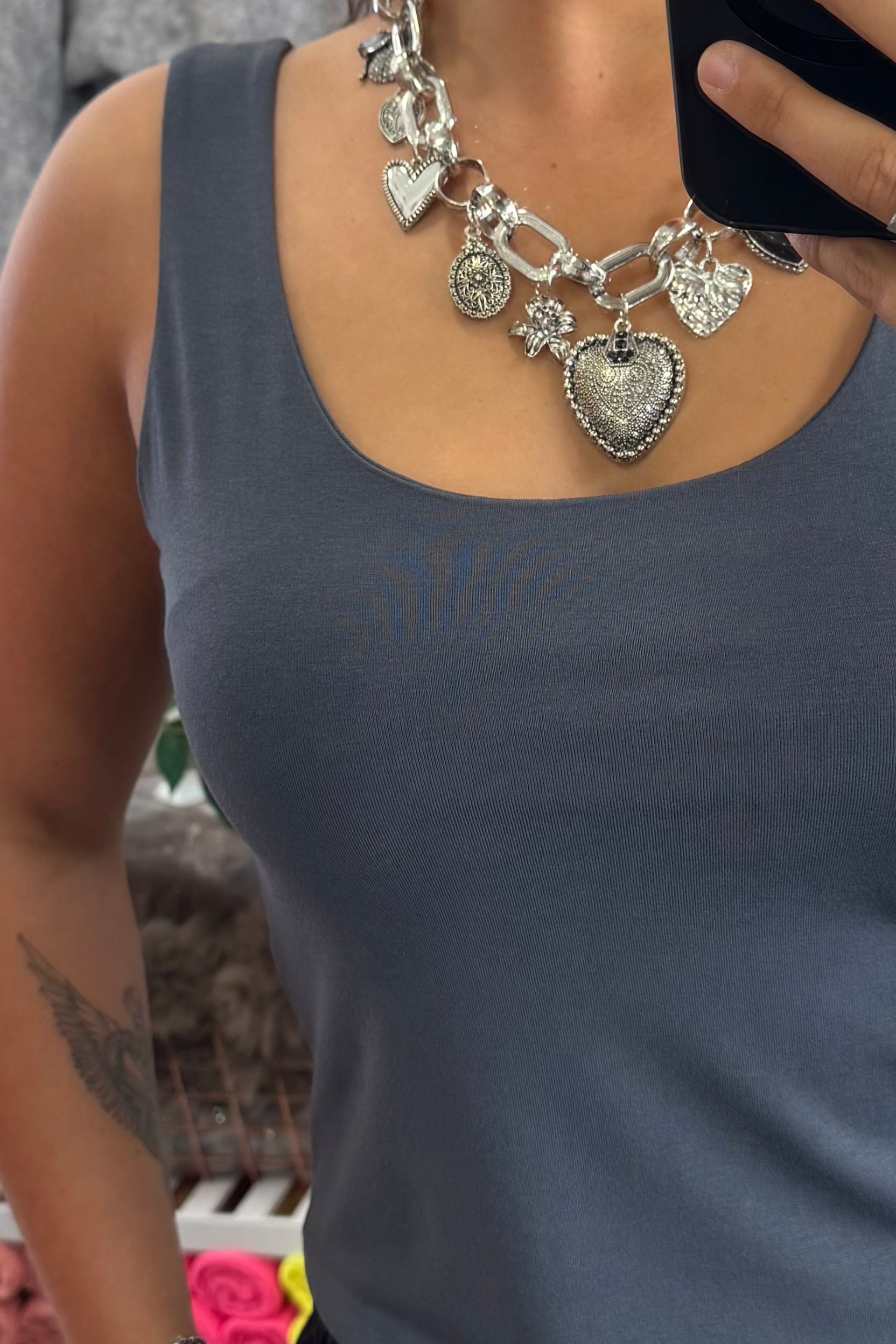 An elevated take on the everyday charcoal grey vest top, featuring wide straps and a clean, refined silhouette. Cut from soft, durable fabric for all-day comfort, this versatile piece transitions seamlessly from layering essential to standalone statement. A timeless staple for the modern wardrobe.
